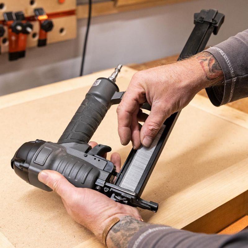 - It is easy to load and has a re-load sight so that the operator can see when the magazine is empty. Other useful features are the depth adjustment which controls the depth to which the nail is driven, the adjustable air exhaust outlet and the quick release front cover to give easy access for clearing jammed nails.