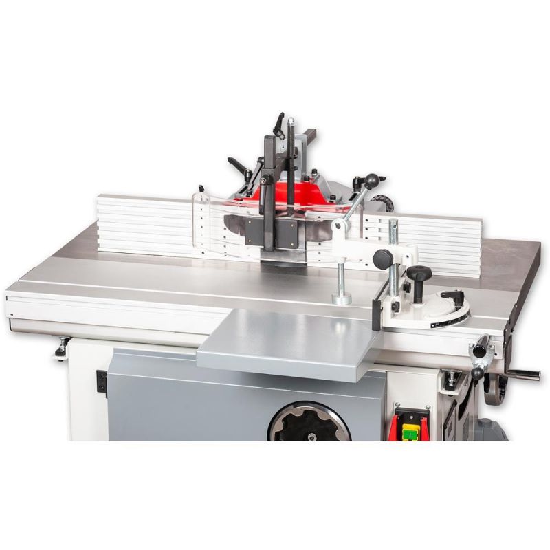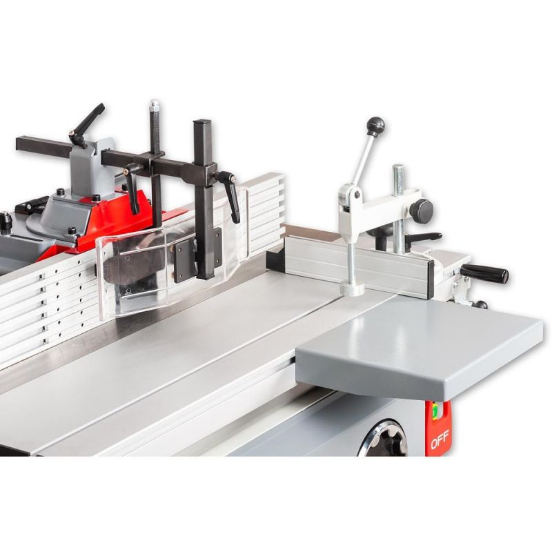 - The spindle hood is cast alloy with long, fully adjustable finger style fences. It, comprehensive work hold-downs and a 100mm dust outlet. A second 100mm dust outlet is located on the stand directly below the cutter block. With the two connected to a suitable extractor waste removal is highly efficient. The machine is supplied with a simple sliding table with a mitre fence and work clamp as standard.
