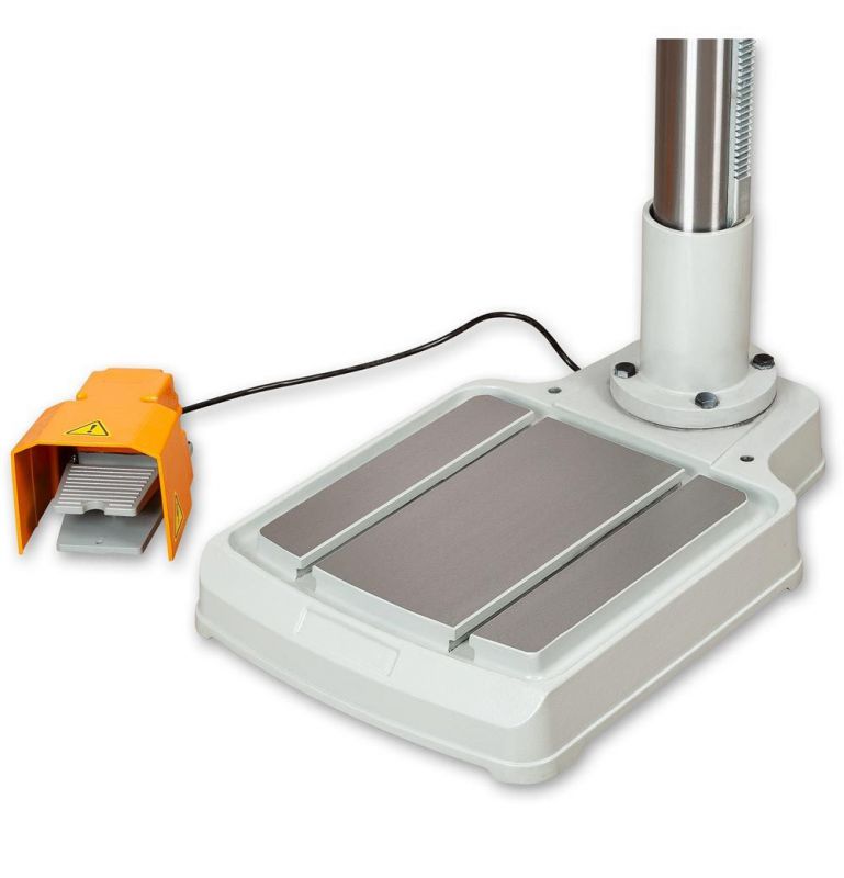 - This impressive floor drill boasts laser point cross hairs and a built-in LED light for precise drilling. The LED speed readout allows you to easily monitor the speed at which you are operating. Additional benefits of this floor drill include a rack and pinion table adjustment for quick and easy adjustments, multi-vee type belts for maximum grip and low vibration, and a foot switch for easy stopping when both hands are in use. The large cast iron table with a polished finish provides a strong and rigid work surface, and the quality 1-16mm keyless chuck allows for quick and easy changing of drill bits.