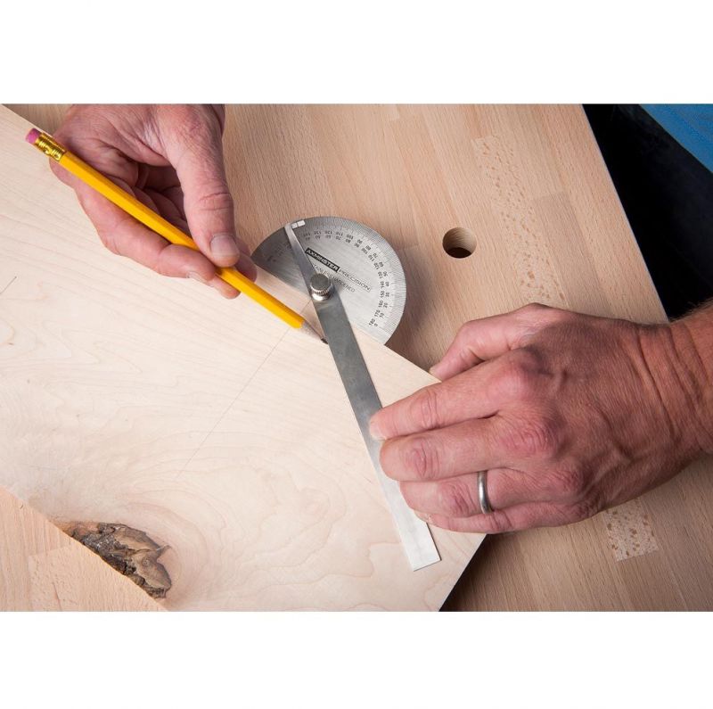 - Here is a tool which is a reliable design tool for the measurement or transferring of angles. Made from stainless steel the Axminster Professional Protractor takes the guesswork out of measuring angles, transferring angles or setting bevels. The protractor head has clearly etched graduations reading from 0° to 180° left to right and right to left. The pointer has an etched mark on a bevelled edge to avoid errors due to parallax. The 145mm adjustable protractor arm locks firmly into position with knurled thumb nut. Head length 90mm, arm length 145mm.