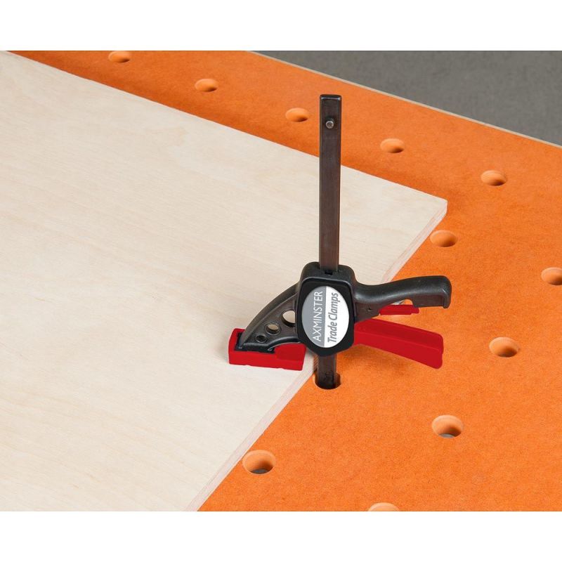 - Owners of multi function workbenches can use the clamp as a hold-down simply by inserting the spigot into a dog hole. The single-handed operation leaves one hand free to steady the workpiece. The moving jaw has a resilient protective pad to prevent damage to delicate surfaces.