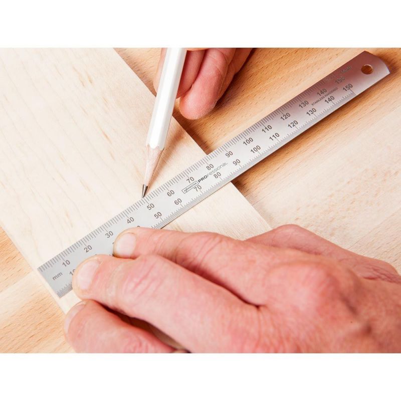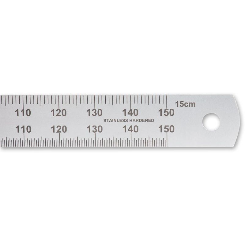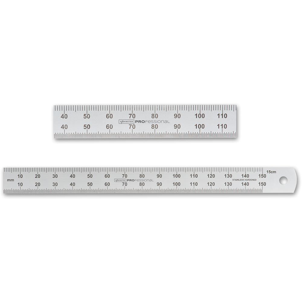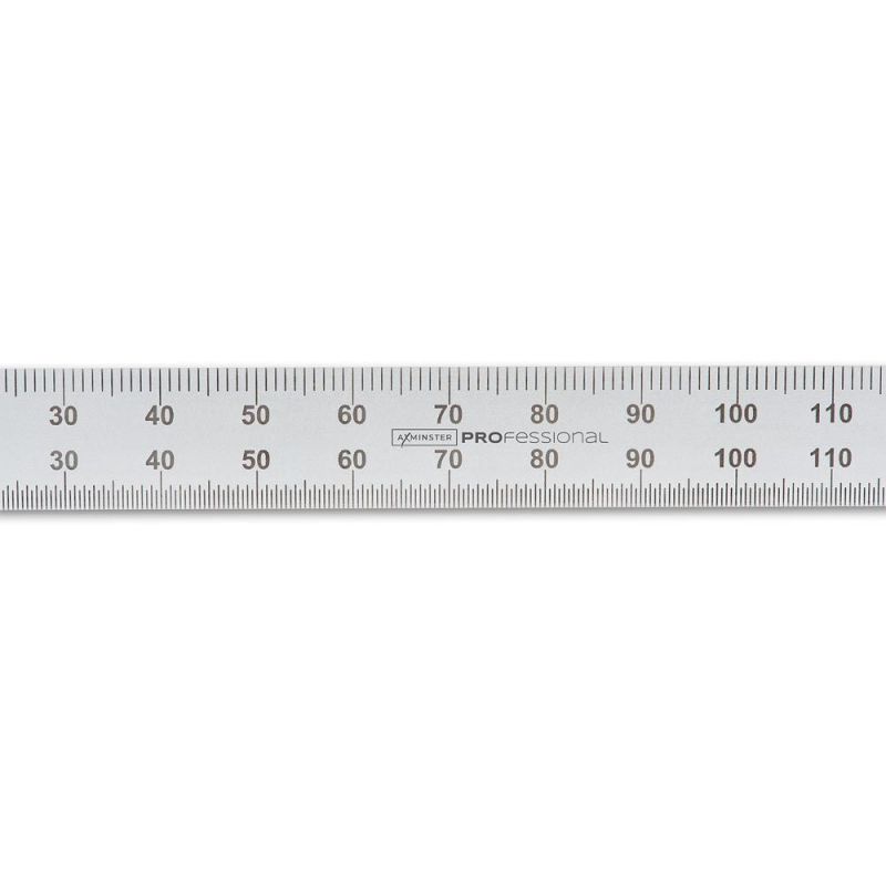 - Hardened stainless steel rules with an anti-glare pearl chrome finish. Their permanently etched graduations with black infill are clear and easy to read. They have millimetre graduations on the upper edge and half millimetres on the lower, numbered every 10mm. The rules read zero from the left-hand end and feature a hanging hole at the opposite end.