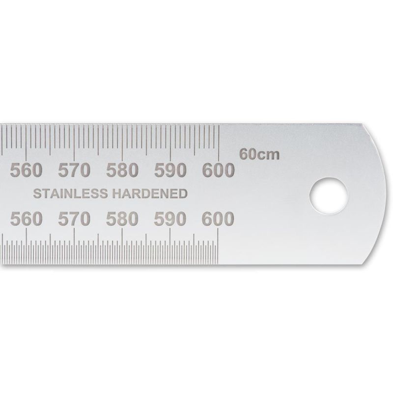 - Hardened stainless steel rule with an anti-glare pearl chrome finish. The permanently etched graduations with black infill are clear and easy to read. Millimetre graduations on the upper edge and half millimetres on the lower, numbered every 10mm. The rules read zero from the left-hand end and feature a hanging hole at the opposite end.