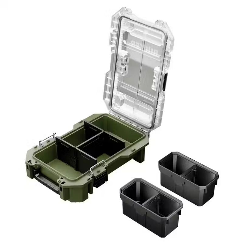 - This half organiser is constructed from high-impact resistant polypropylene. Inside, you will find two bins (compatible with side rails) and dividers for keeping small parts and components safe and organised. The transparent lid offers easy visibility of the contents, while the integrated carry handle enhances portability.