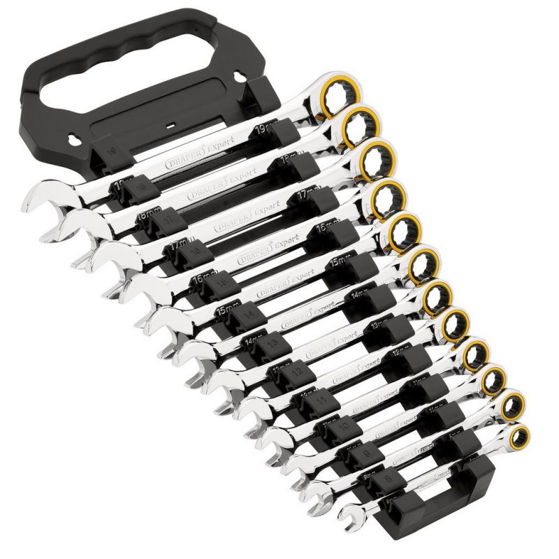 - This 12-piece Draper Expert HI-TORQ® metric reversible ratchet combination spanner set is manufactured from hardened and tempered chrome vanadium steel, with a mirror chrome plate finish for corrosion protection.