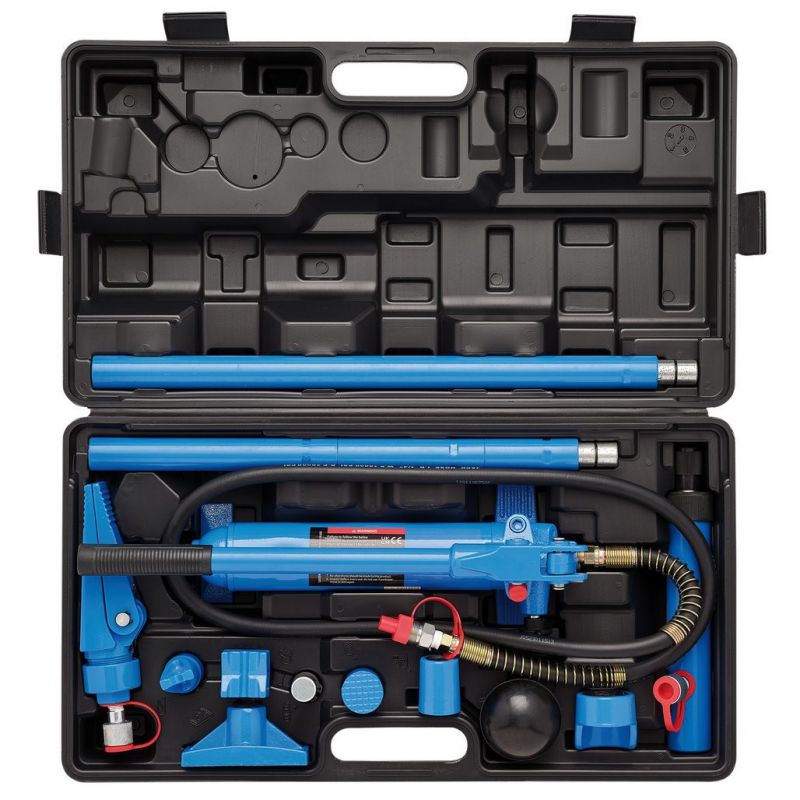 This comprehensive portable kit includes a hand-operated hydraulic power unit suitable for pushing, pulling, straightening, bending and spreading to return vehicle bodywork structures to their original form. Automatic bleeding. Long handle reduces the pumping required and the easy snap together interlocking extensions ensure swift body work repairs. The heavy-duty pump is fitted with an automatic safety overload valve. Strong flexible hose with spring guards at both ends. Compatible with other snap together kits and accessories. Supplied inside a sturdy plastic storage case.