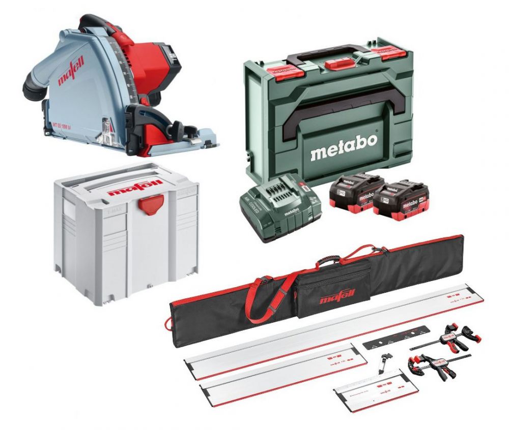 Mafell 91E003 MT 55 18 M BL Cordless Plunge Saw Package with Rails 209592 and Metabo 8ah