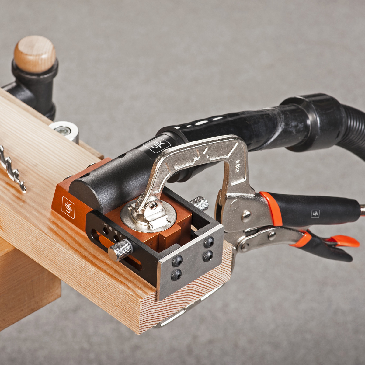 Especially developed for the UJK Pocket Hole Jig, this plate allows you to take the jig off the bench mounted unit and use it as a portable jig. Especially useful for restoration work or joints that need to be worked where you cannot clamp whilst working on a bench. Best used with the UJK Locking C Clamp. Note, finish may be black or bright.