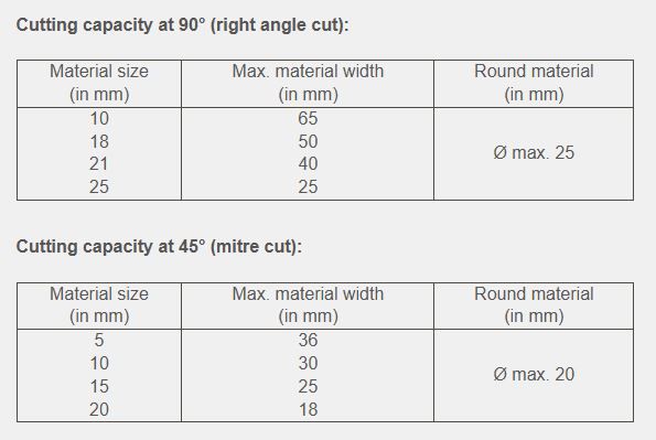 - The compact, tight and torsion-free design allows clean and safe cutting of workpieces up to 65mm wide and 25mm thick as well as round material up to a maximum. diameter of 25mm.