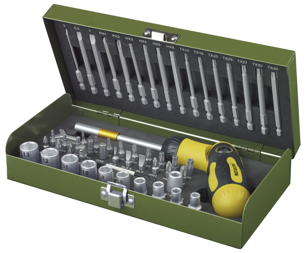 - Screwdriver set with foldable ratchet-screwdriver and magnetic holder, 54-piece.