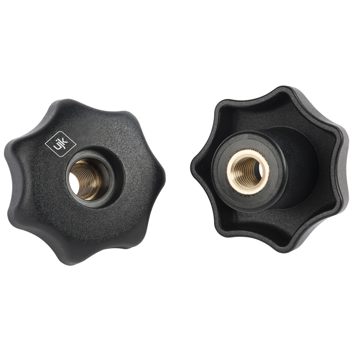 These are nylon, shatterproof star knobs with female threaded brass inserts. They make a great addition to home-built jigs and fixtures or a replacement for a standard or broken knob on machinery. The through tread allows use anywhere regardless of the bolt length. The metric thread brass insert guarantees smooth clamping in all situations. The 40mm diameter, 7-lobe design makes tightening and releasing easy. These knobs are resistant to solvents, coolants, oils etc. Supplied in pairs, available with M6, M8 or M10 thread.