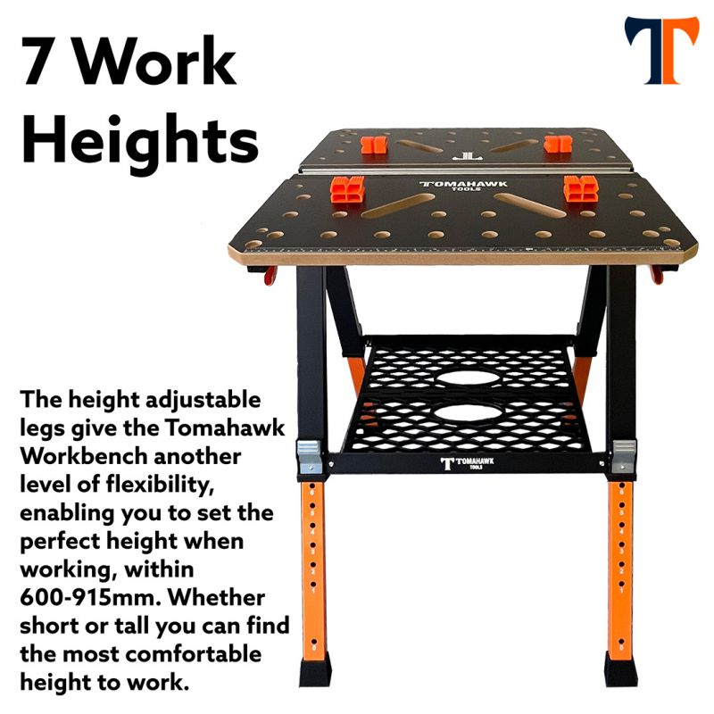 - 7 Work Heights – The height adjustable legs give the Tomahawk Workbench another level of flexibility, enabling you to set the perfect height when working, within 600-915mm. Whether short or tall you can find the most comfortable height to work.