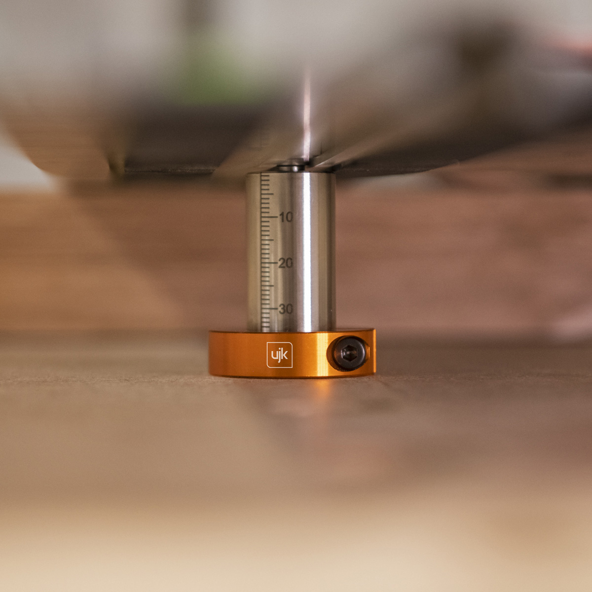 These stainless steel guide rail dogs, hidden beneath the rail, offer superior security and precision. The guide rail dogs prevent saw cutting across other dog holes. Tee-bolt design fits into the rail’s Tee-slot, replacing the need for rail clips. The knurl on the lead taper helps to lock the dog to the rail. Laser-etched 0-75mm scale for wood thickness measurement. Supplied in a pack of 2 with split stop collars to set the wood thickness.