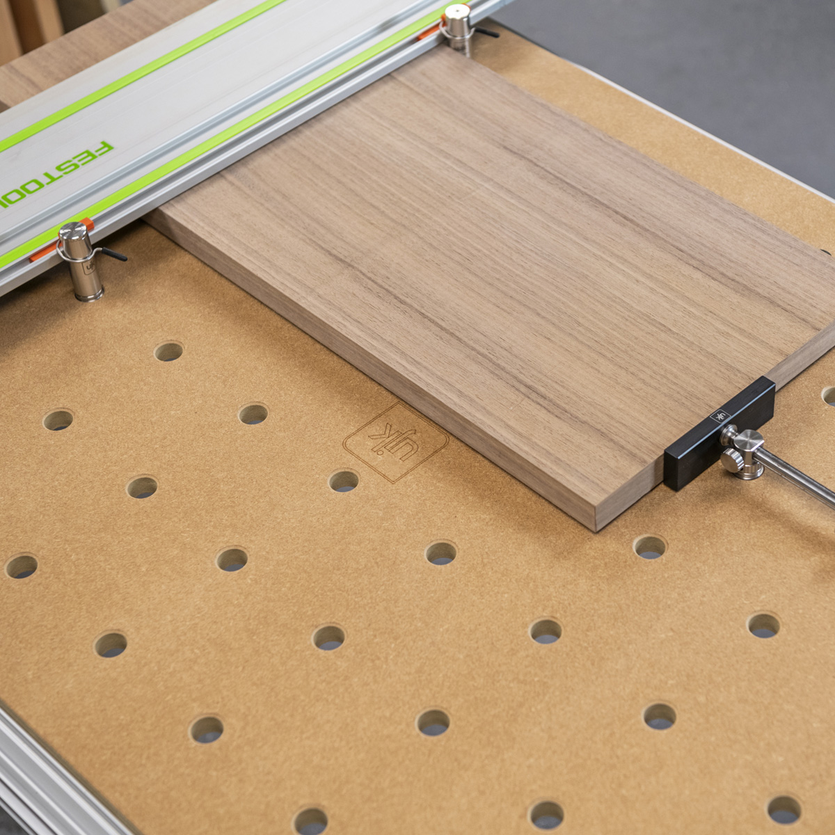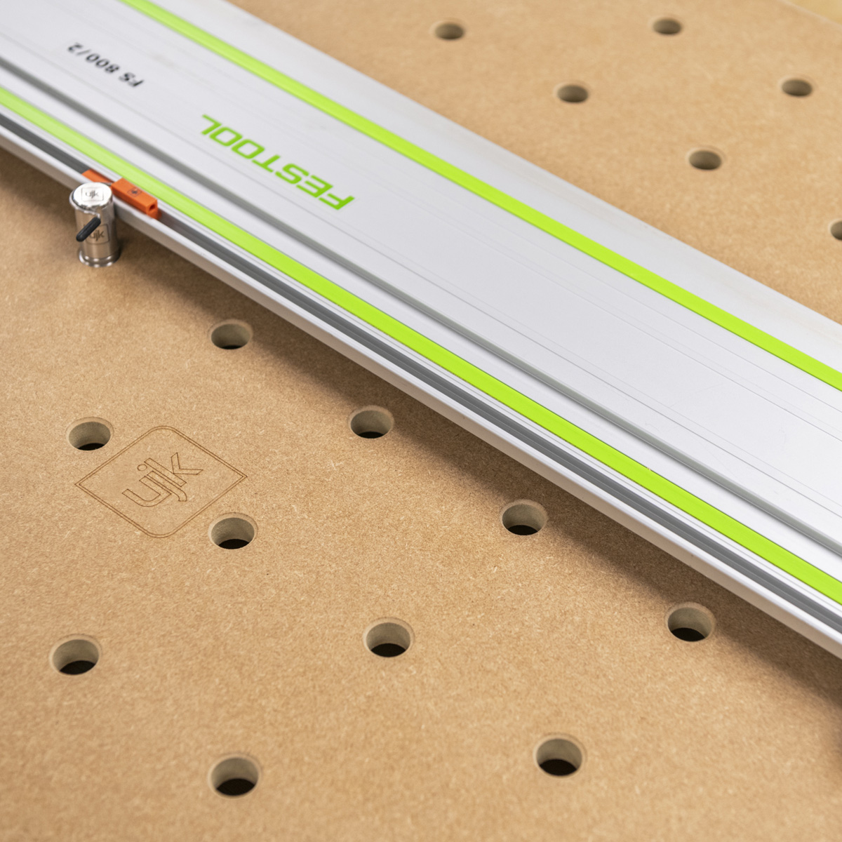 The UJK MRMDF Top for Bench dogs is 18mm thick, moisture resistant MDF. This material is versatile, lightweight and ideal for workshops with varying humidity. The UJK MRMDF top has a grid of 20mm plain chamfered dog holes: 11 holes x 7 holes 96mm apart. These holes are CNC machined to guarantee accuracy, aligned lengthways and widthways with the rows perfectly square to each other. These dog holes allow you to use bench dogs and many other accessory clamps, guide rails and stops to hold, saw, rout and machine your work with perfect accuracy. Made from 18mm thick MRMDF, the 1,102mm x 718mm top fits perfectly in the UJK Multifunction workbench frame or the Festool MFT base. This makes it a suitable replacement for the standard Festool top.