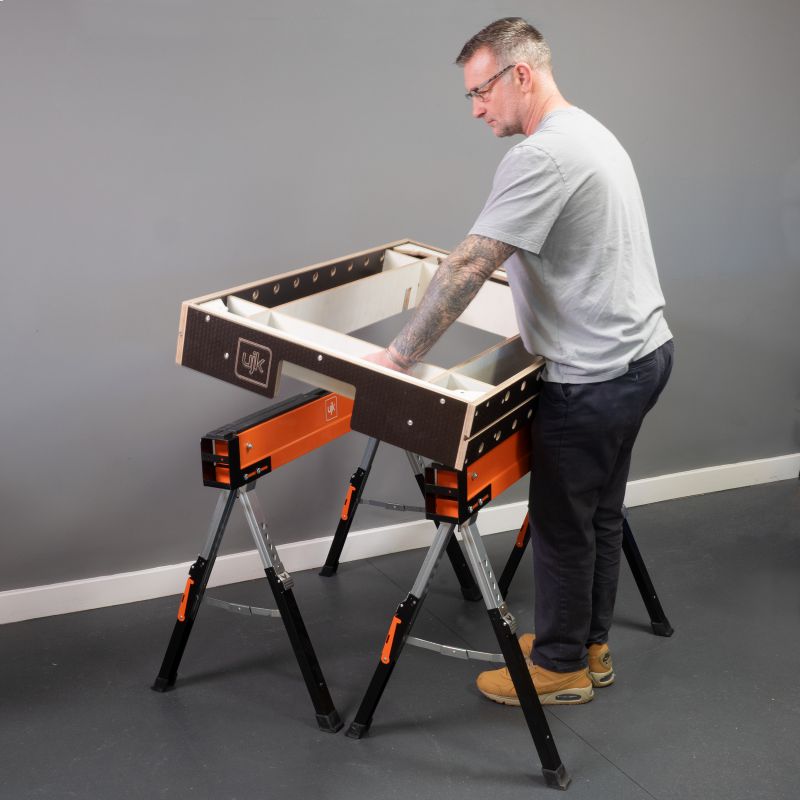 - The UJK Sawhorses, all-steel, folding saw horses, designed for convenience, versatility and durability. Compact and portable, they fit easily into your van or workshop. The legs fold neatly into the top rail and include carry handles for easy transport and storage. Featuring a quick-release button for easy setup, adjustable material support arms, hinged leg brackets, a reinforced top, and telescopic legs for customizable height. With rubber feet for stability and corrosion-resistant coating, each saw horse supports up to 590kg, making them perfect for creating a solid workbench on-site.