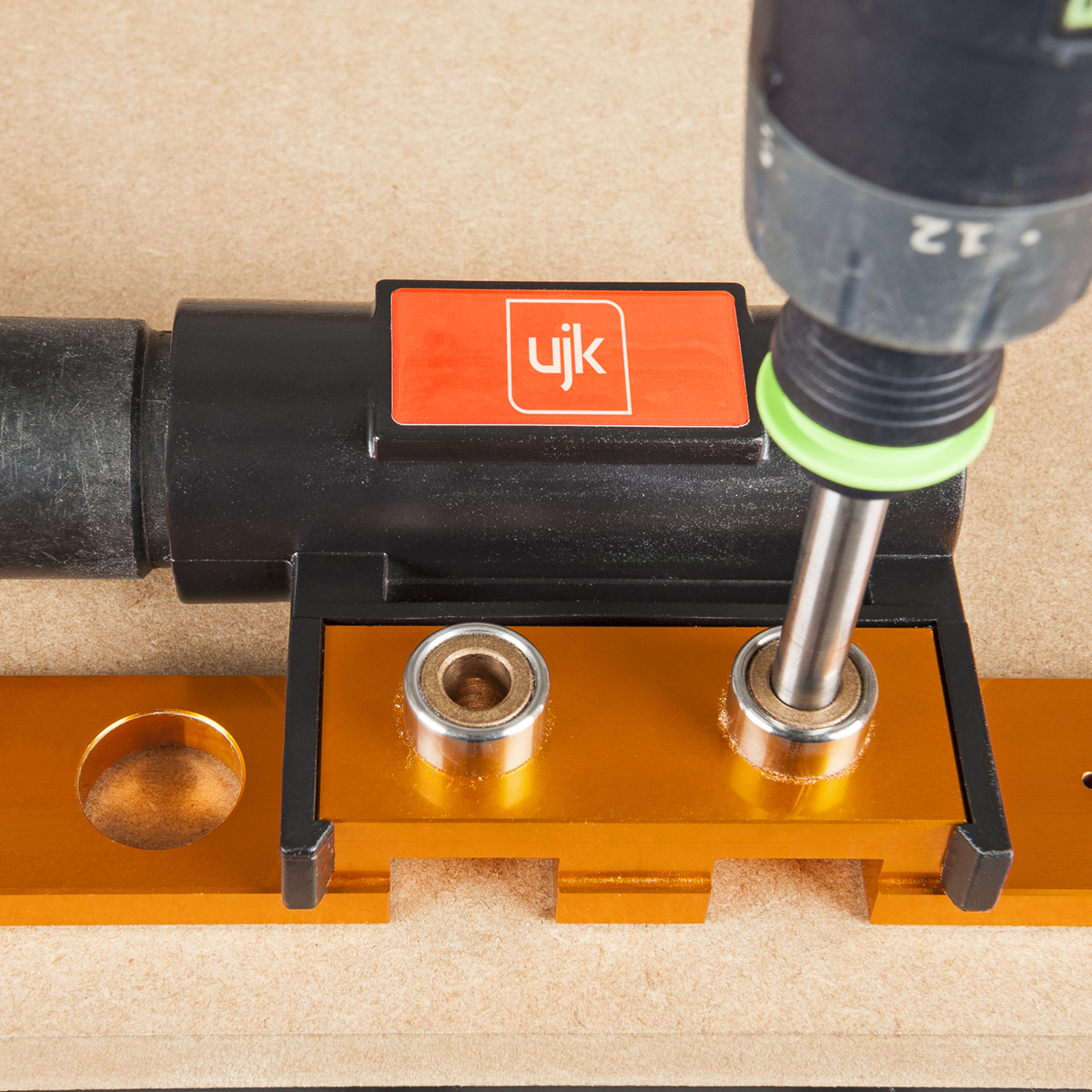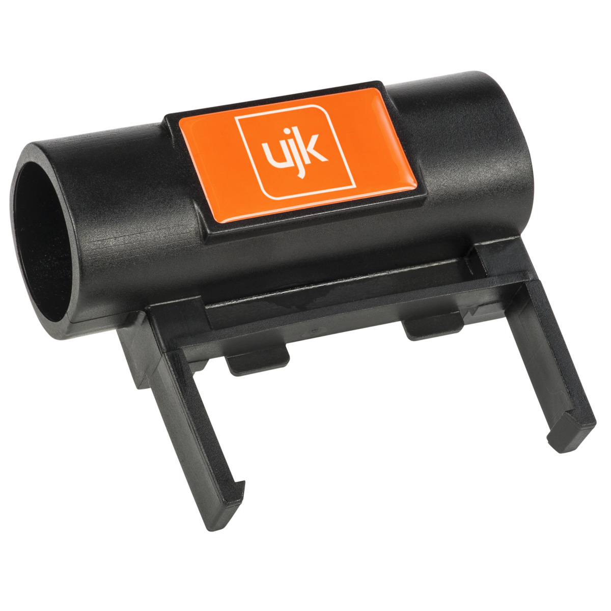 A dust extraction for UJK Parf Guide System, the UJK Parf Dust Port firmly attaches to the Parf Guide Block (part B). It allows direct connection to a vacuum extractor removing dust and debris. An invaluable tool when drilling into MDF to produce your multifunction bench top; preventing dangerous MDF dust entering the working environment and ensures the drill bushing remains free of debris. The design allows the dust port to fit on either side of the guide block - whichever is most convenient. The outlet is 38mm diameter for a straightforward connection to many common extractor hoses (some extractors may require a simple taper adaptor).