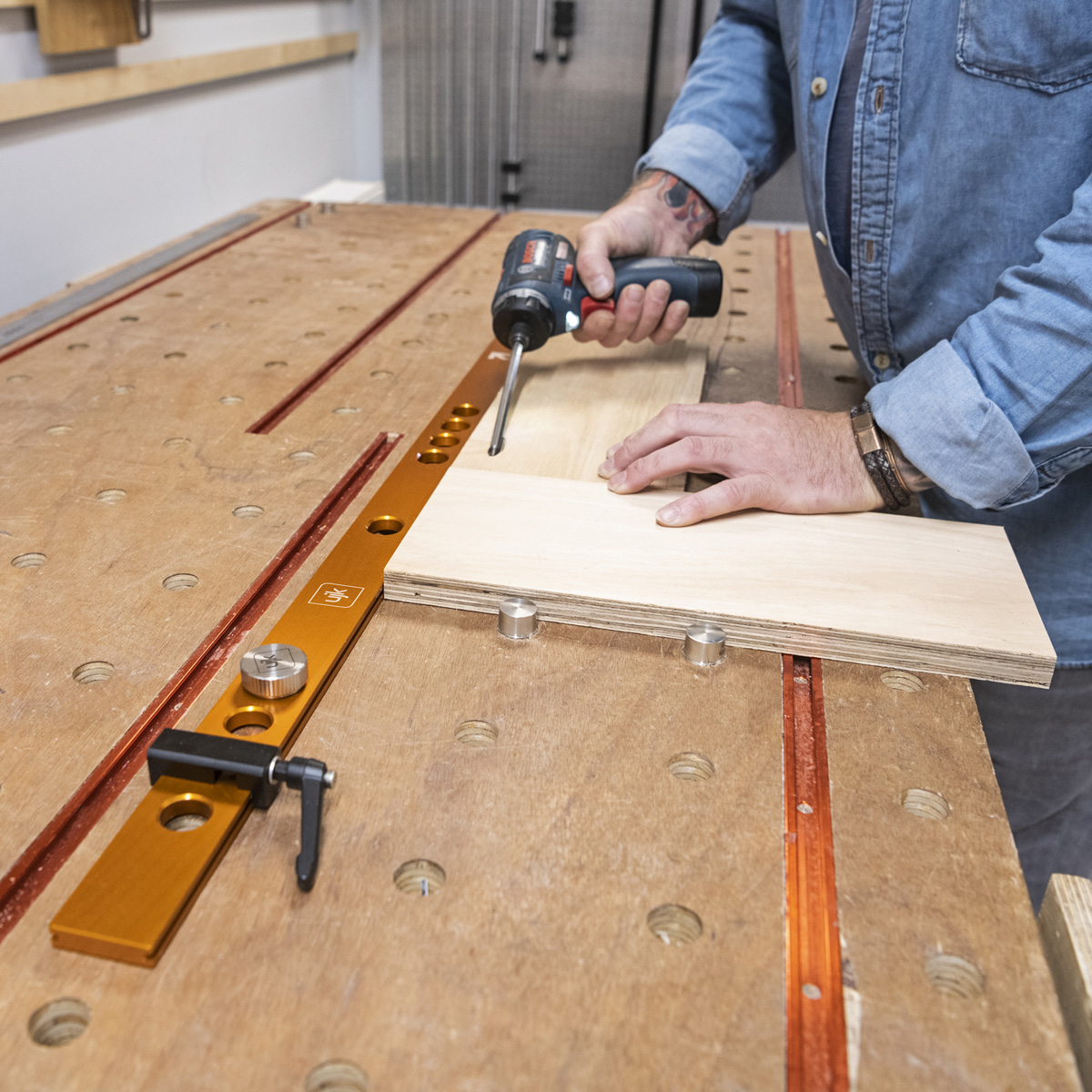 The UJK Parf System Fence & Stop Kit ensures a steady workbench setup, removing the need to adjust bench dogs for different cut lengths. The adjustable stop delivers consistent, precise cuts, moving the fence by one hole, or 32mm, allows for quick marking or drilling changes, increasing efficiency and precision. Using two fences at a 90° angle assists in assembling cabinet frames or drawers. The fence can also be placed on top of a workpiece and includes a hole for 45° angle settings.