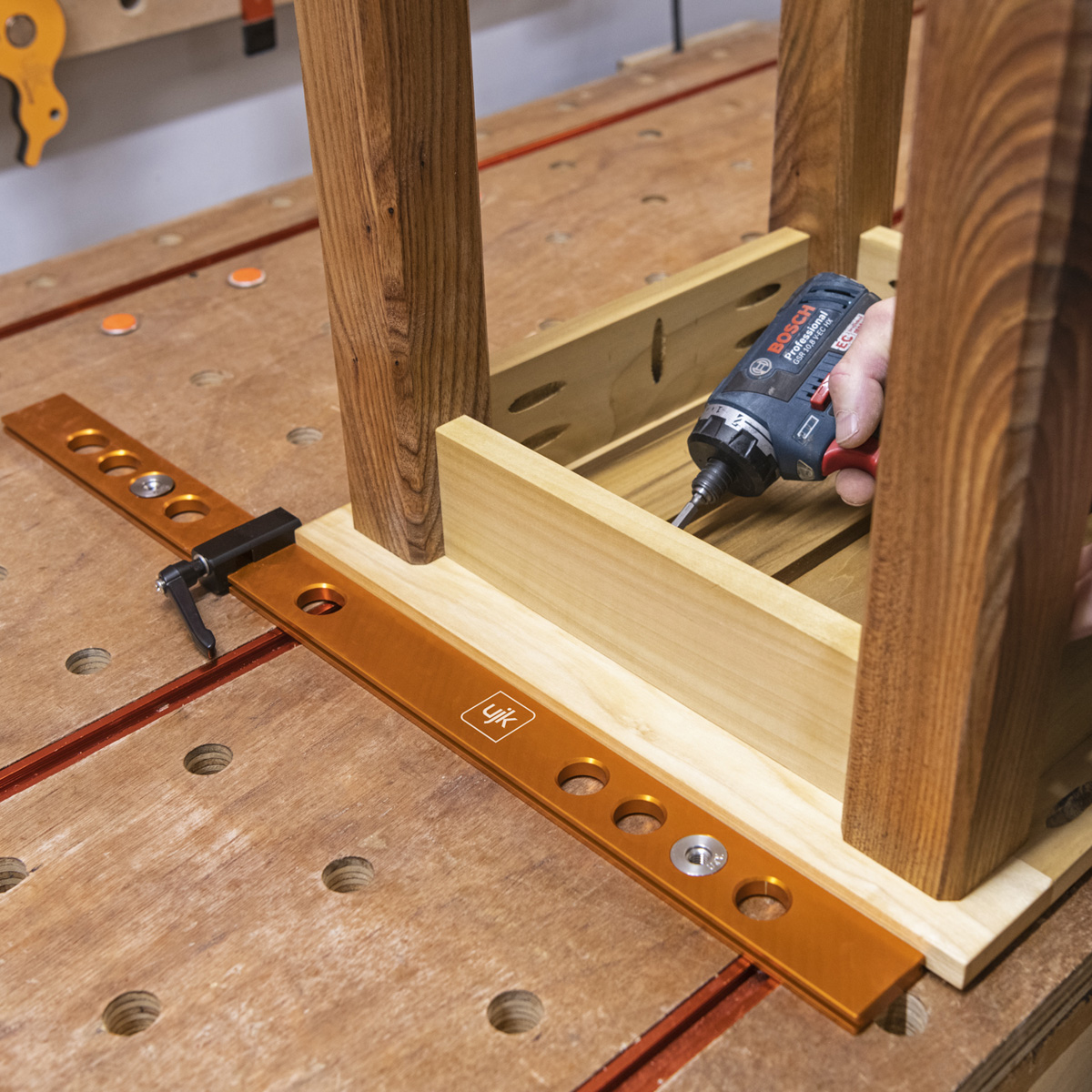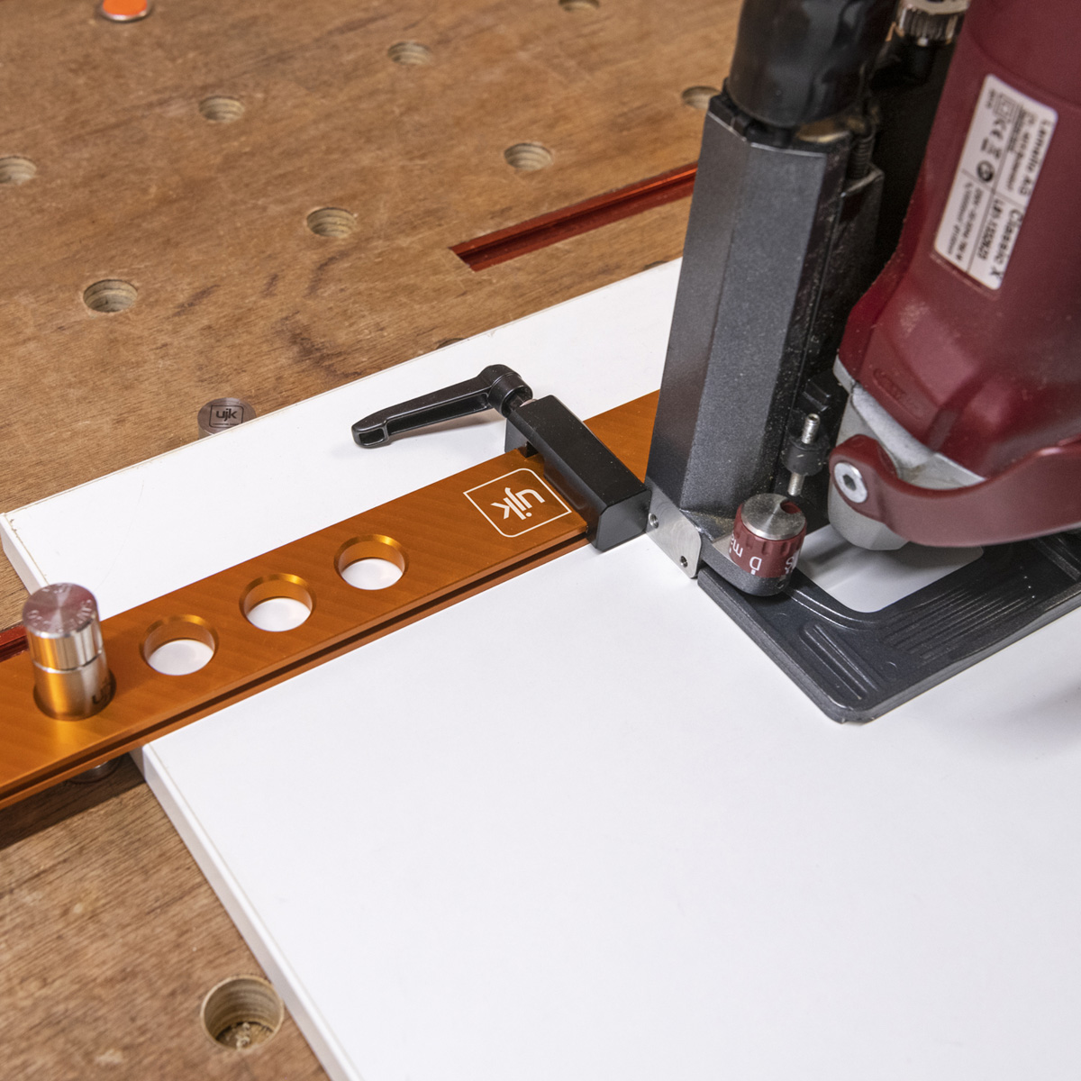 The UJK Parf System Fence & Stop Kit ensures a steady workbench setup, removing the need to adjust bench dogs for different cut lengths. The adjustable stop delivers consistent, precise cuts, moving the fence by one hole, or 32mm, allows for quick marking or drilling changes, increasing efficiency and precision. Using two fences at a 90° angle assists in assembling cabinet frames or drawers. The fence can also be placed on top of a workpiece and includes a hole for 45° angle settings.