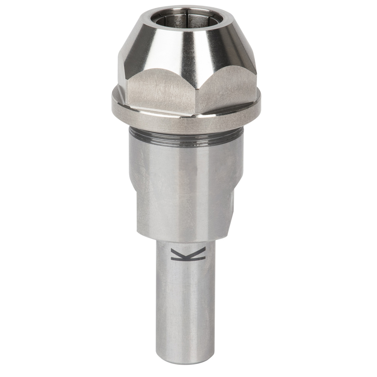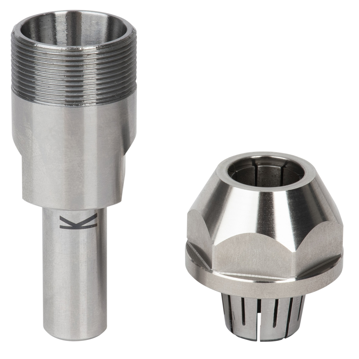 The UJK Router Collet Extension solves a common issue when using routers inverted in a table: even fully plunged, the collet often sits below the table surface, limiting cutting depth. This precision extension uses standard ER20 engineering collets, which grip over a 1mm diameter range without losing accuracy. Supplied with a 1/2" shank collet and compatible with 8mm, 1/4" (6.35mm), and 1/8" (3.2mm) shanks, it provides a safer, more stable cut with less vibration. The collet nut includes an ejection ring for fast, easy cutter changes, and the extension supports speeds up to 18,000?RPM. Tip: Insert the collet extension at least 2/3 of the way in and up to the K line.
