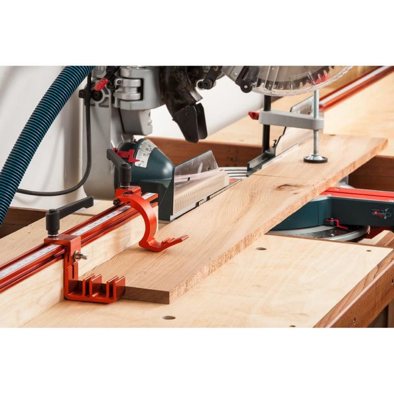 These are available individually should you wish to make an extended fence. The track lengths are each 610mm long and feature top and front T-slots. The track’s profile fits onto the top edge of a self-made wooden fence either side of a mitre saw, for example. A groove along the back edge forms a convenient guide for placing your drill bit to make screw holes. The T-slots give you the option of using any variety of home-made jigs or fixtures with the track. See User Manual Download for dimensioned drawing