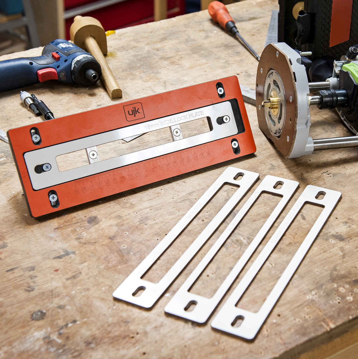 Achieve perfectly square lock mortices quickly and reliably with the UJK Compact Lock Jig, built for accuracy and durability. Made from 12mm high-pressure laminate, it’s dimensionally stable and guaranteed never to warp. Fully adjustable for lock faceplates up to 175 mm, it comes with four interchangeable templates covering the most common sash, mortice, and deadlock sizes. Keyhole slots allow fast template changes, while simple centre-line setup ensures square mortices for precise door fitting. Suitable for doors up to 58 mm (2.1/4") thick, it works with a 1/2" router with a 12.7 mm (1/2") straight cutter, 16mm guide bush, and standard clamps for easy, professional results.