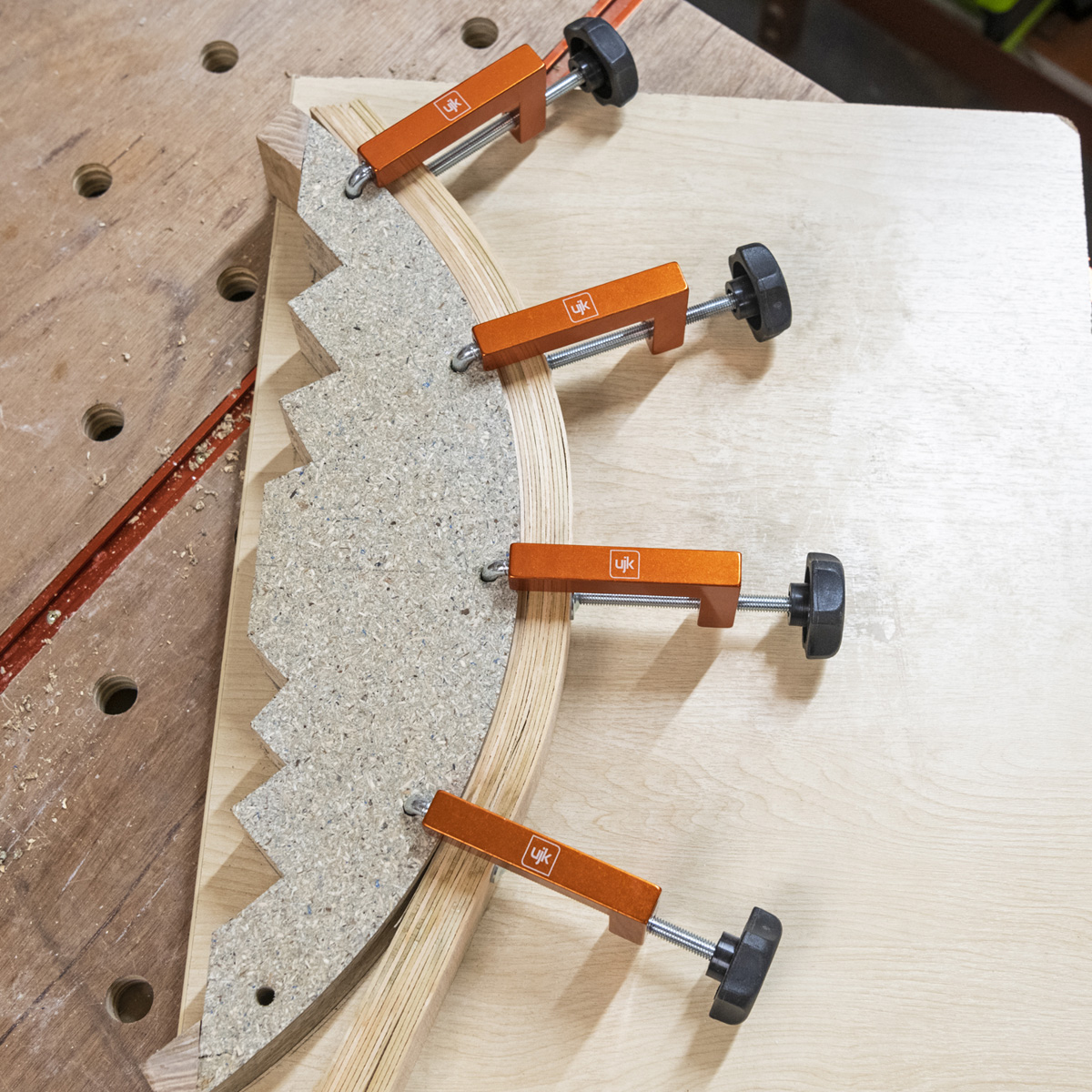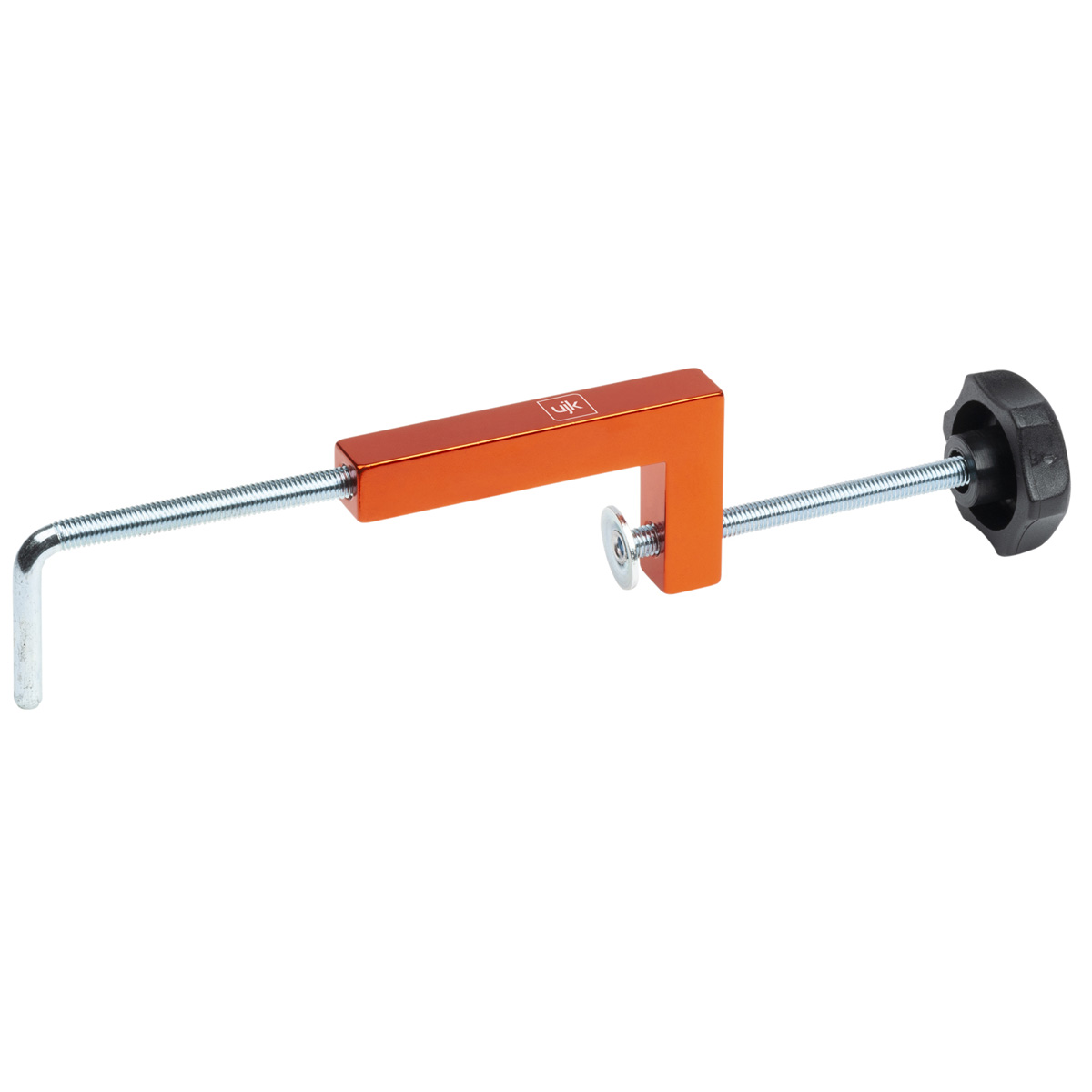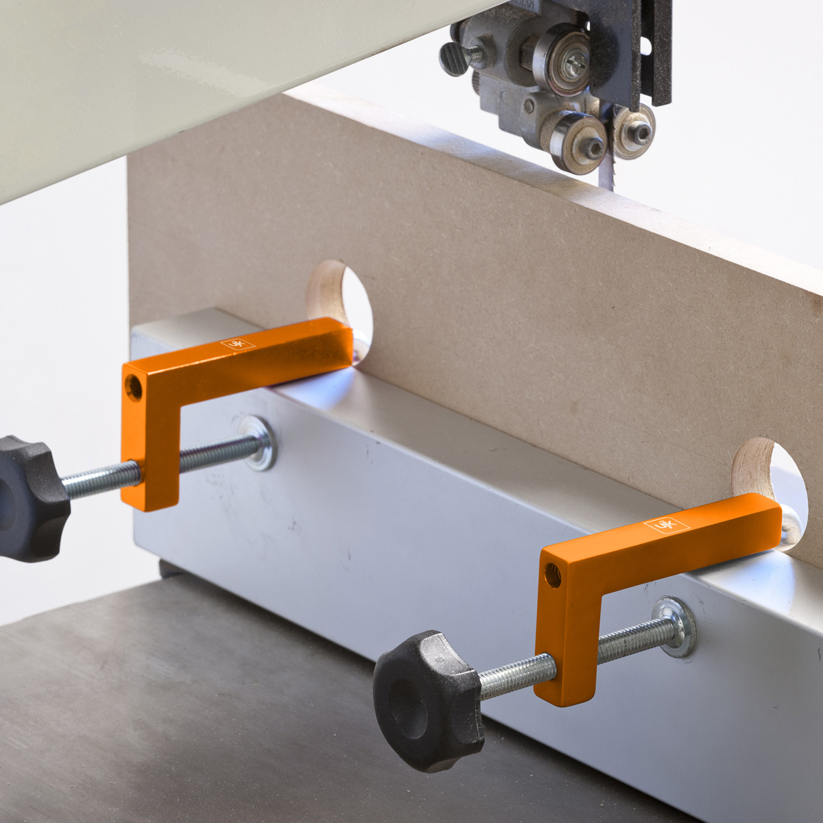 Secure your sub fence with the UJK Universal Fence Clamps. These clever clamps allow you to attach a wooden sub-fence securely, leaving the face obstruction-free, ready for cutting. Simply drill an 8.5mm hole in the fence, and the clamps will hold the sub-fence in place. The 16mm square section anodised aluminium body and 7mm round steel bar ensures durability. The clamping screw is 80mm long. This gives the clamp a maximum capacity of just over 150mm, with a throat depth of 38mm.