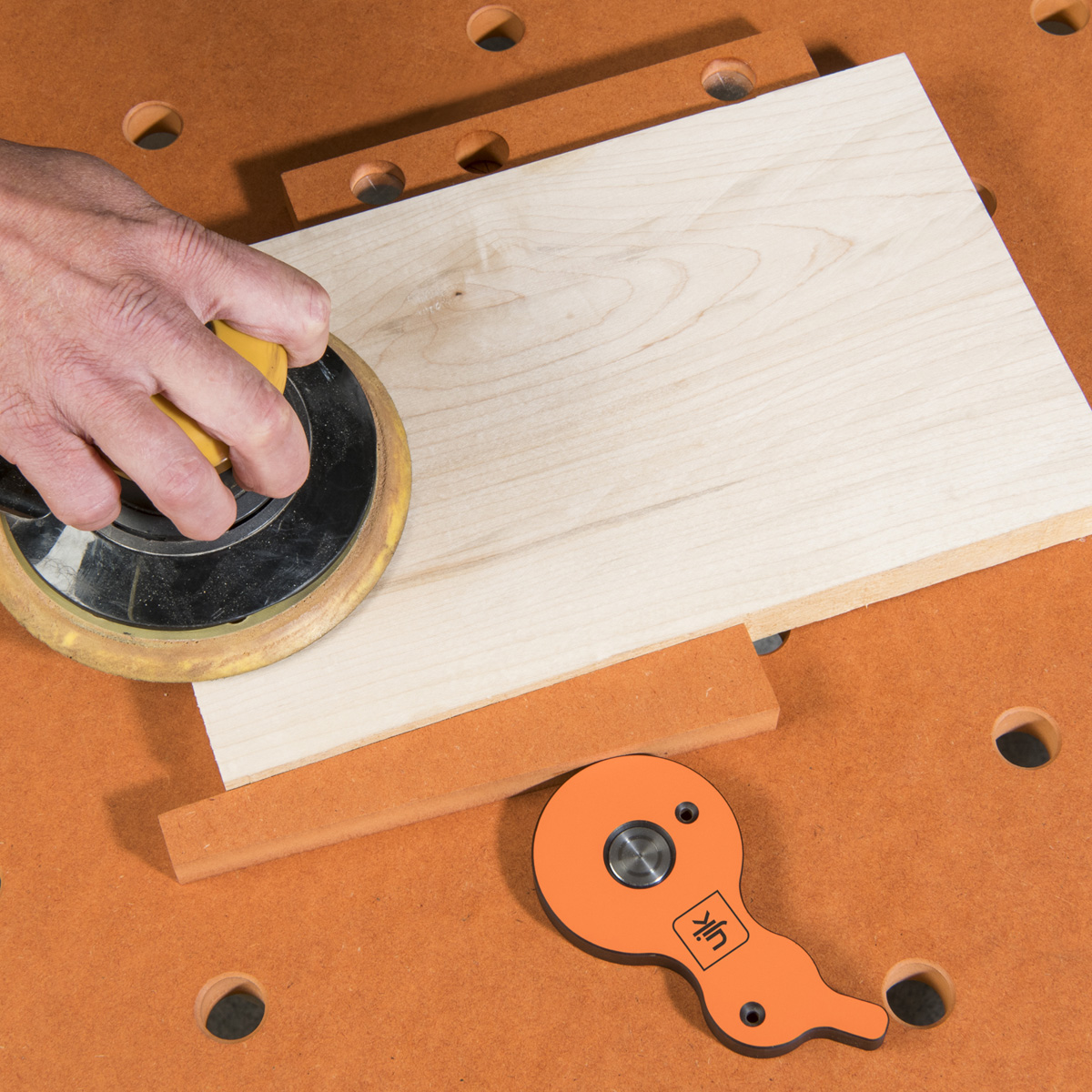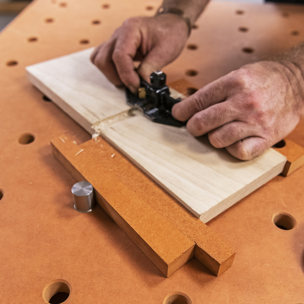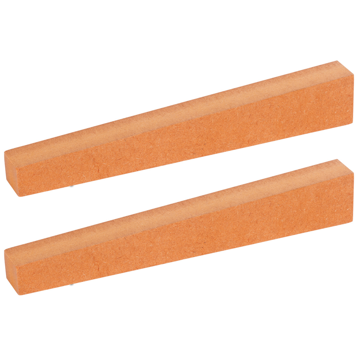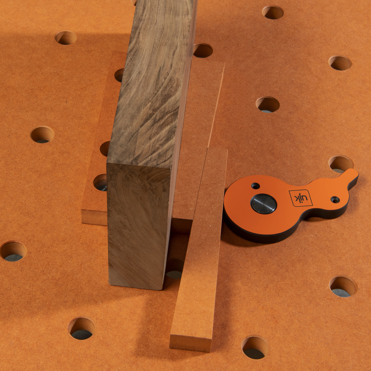 The wedges taper from 32mm to 27mm over a length of 200mm. They are CNC cut from 20mm thick HDF Valchromat. This material is very durable and easily tough enough to withstand gentle tapping with a hammer to lock the wedge. Using two wedges acting against each other ensures the applied force is at 90° to the edge of the workpiece.